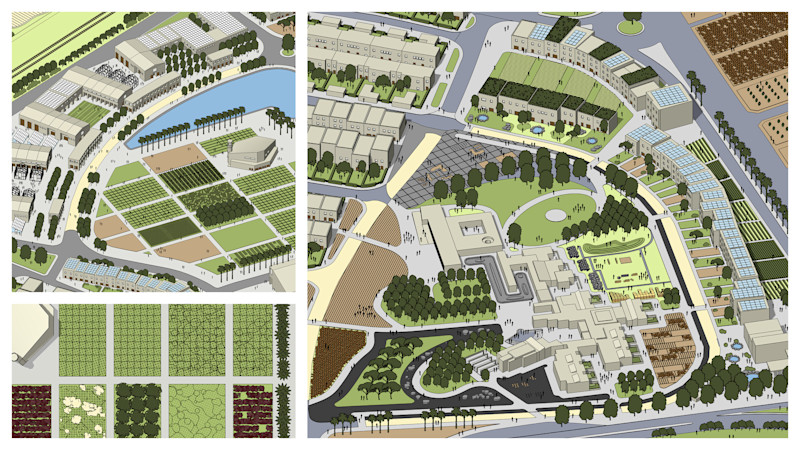 A view of planted fields and an open flower market located within the proposed campus masterplan.
