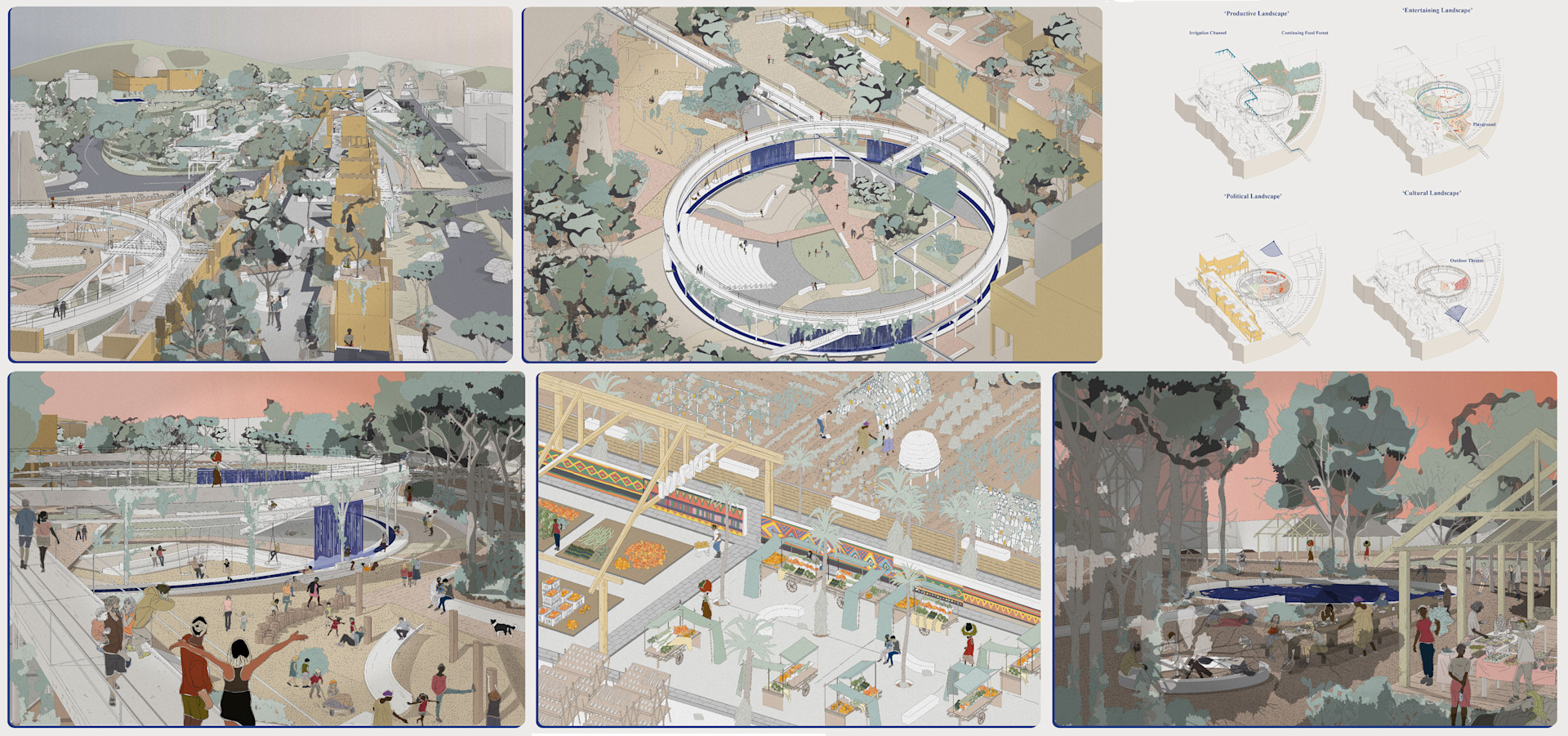A series of views of the activated landscape and town centre of Gibellina Nuova. People can experience the continuous food forest from the townhall roof gardens or experience the site from the townhall plaza and outdoor theatre.